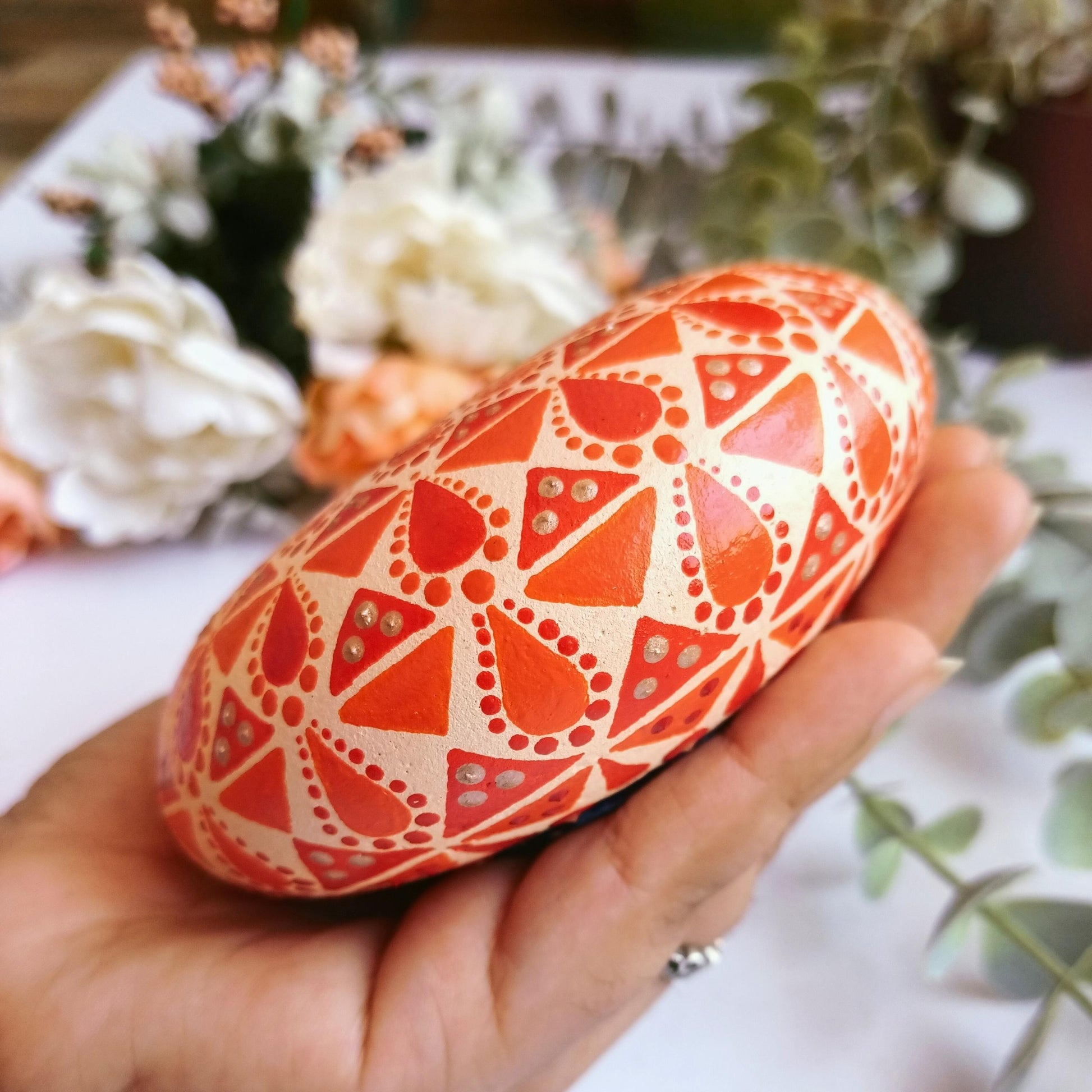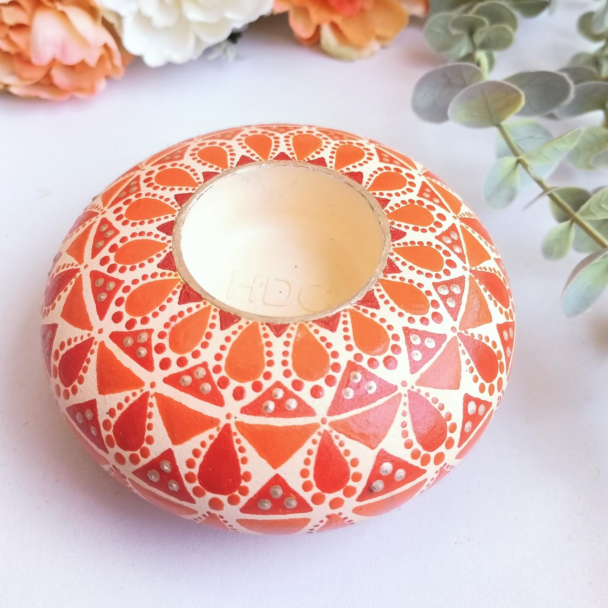 The holder is decorated with a beautiful dot mandala design. The mandala is a symbol of unity and wholeness, and the colors represent hope and optimism.